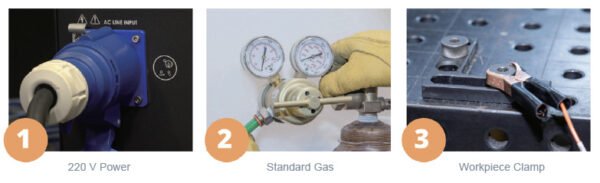 The Clearly labeled rear connections make getting started fast and easy. Just plug in the power cord and gas connection, attach the workpiece clamp, and the system is ready to go.